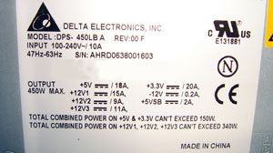 写真のようにHDDの後ろは電源ユニットがある。これで、HDDから来る風を電源FANで外に排出するようになっている。電源の上にあるのはB-CASスロット。ちょっと邪魔(笑) 電源はおなじみDELTA製のDPS-450が使われている。トータル450Wで、12V系が340W。まあ、SLIだのを使わなければ十分だ。