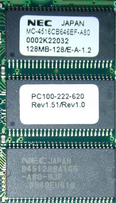 なんてことはないメモリだが、とりあえずクロックテスト(^_^;)をしてみた。3-2-2ではあるが、P3B-Fの最高クロックである150MHzが通るのだ!!しかも、もう一枚ある3-2-2で150MHzが通るメモリとの2枚差しもOKであった!!うーっむ。侮りが足し!NEC。